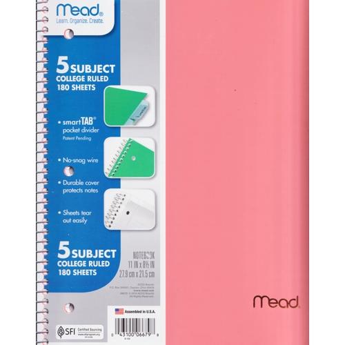 Mead 5-Subject College Ruled 8.5" x 11" Plastic Cover Spiral Notebook (180 Sheets) Colors Vary