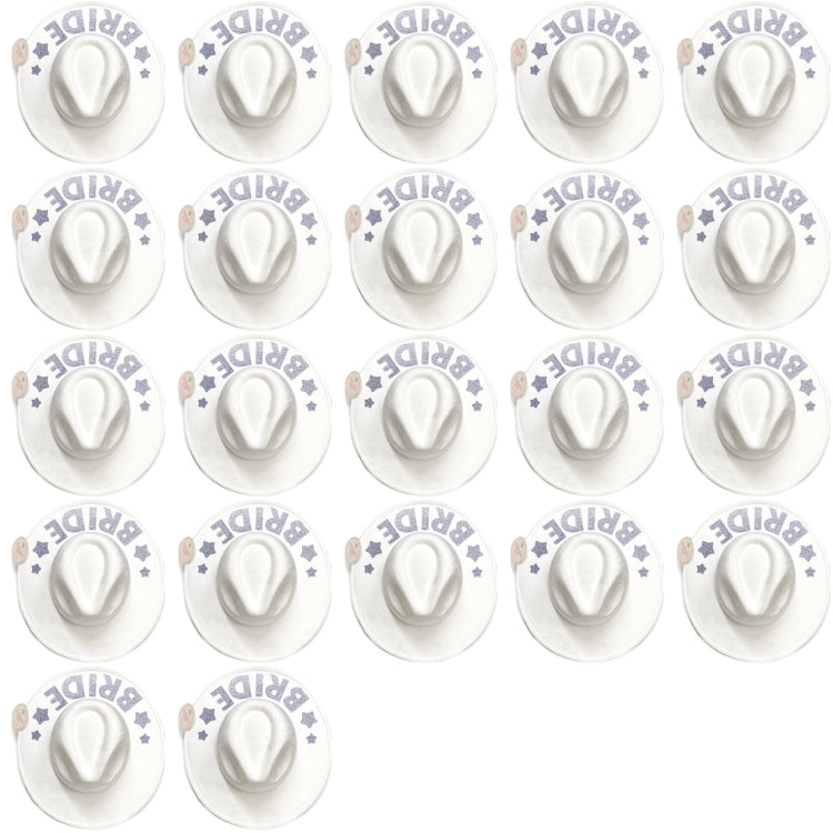 - Stylish, chic white panama hat features soft felt material, structured wide brim, teardrop-shaped crown, sparkling silver glitter stars, sparkling silver glitter text BRIDE