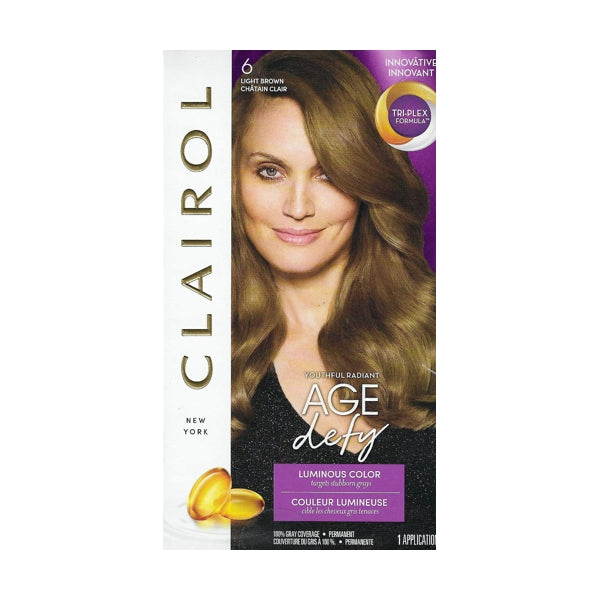 Clairol Age Defy Luminous Color Hair Color Permanent Kit with Tri-Plex Formula (6 Light Brown) 100% Gray Coverage